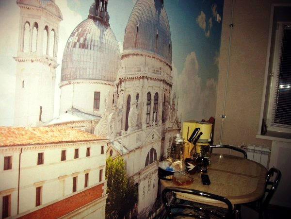 На кухні краще наклеїти малюнок, що зображає водну поверхню з численними човниками. Ще одним відмінним варіантом вважаються фотошпалери з вузькими венеціанськими вулицями або видом на Венецію з вікна, обставленого квітами і прикрашеного красивими шторами.